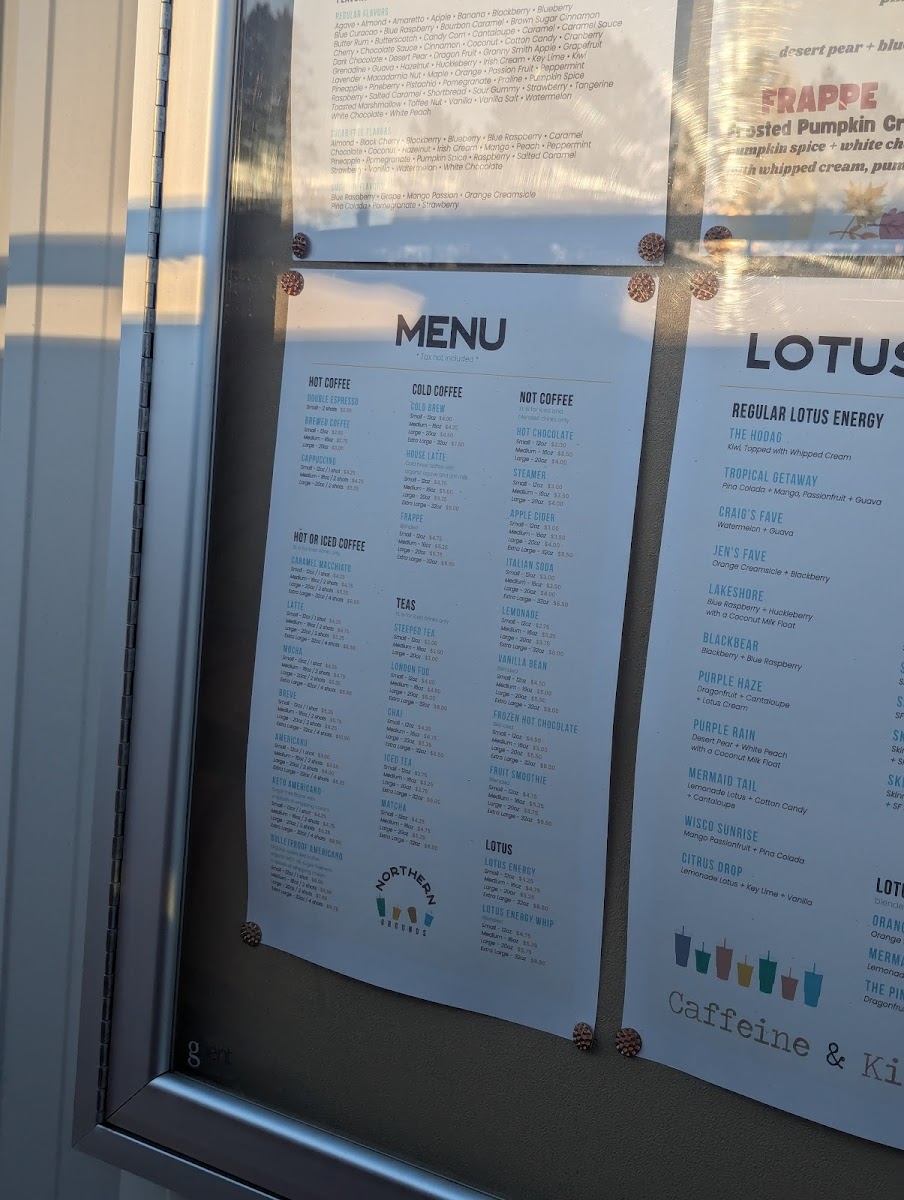Northern Grounds offers a diverse and inviting menu, perfect for any time of the day. For those craving a sweet and refreshing treat, their Frosted Pumpkin Crunch frappe is a must-try. If you're in the mood for something non-coffee, the selection includes comforting options like Hot Chocolate, Steamer, and Apple Cider, alongside refreshing Italian Soda and Lemonade. Lotus fans can enjoy a variety of Lotus Energy drinks, including The Hodag, Tropical Getaway, and Craig's FaveJen's Fave, as well as lighter options like the Skinny Lotus Energy drinks, such as Skinny Lakeshore and Skinny Strawberry Peach. For a fun twist, try a Lotus Energy Whip, such as the Orange Creamsicle Whip or the vibrant Mermaid Tail Whip. Coffee lovers will appreciate the range of options from classic Caramel Macchiato and Latte to rich MochaBreve and Americano. There’s also cold options like Cold Brew and the signature House Latte, making it easy to enjoy a flavorful pick-me-up, whether hot or iced. Northern Grounds caters to a wide variety of tastes, ensuring that every visit is filled with options to please any preference.